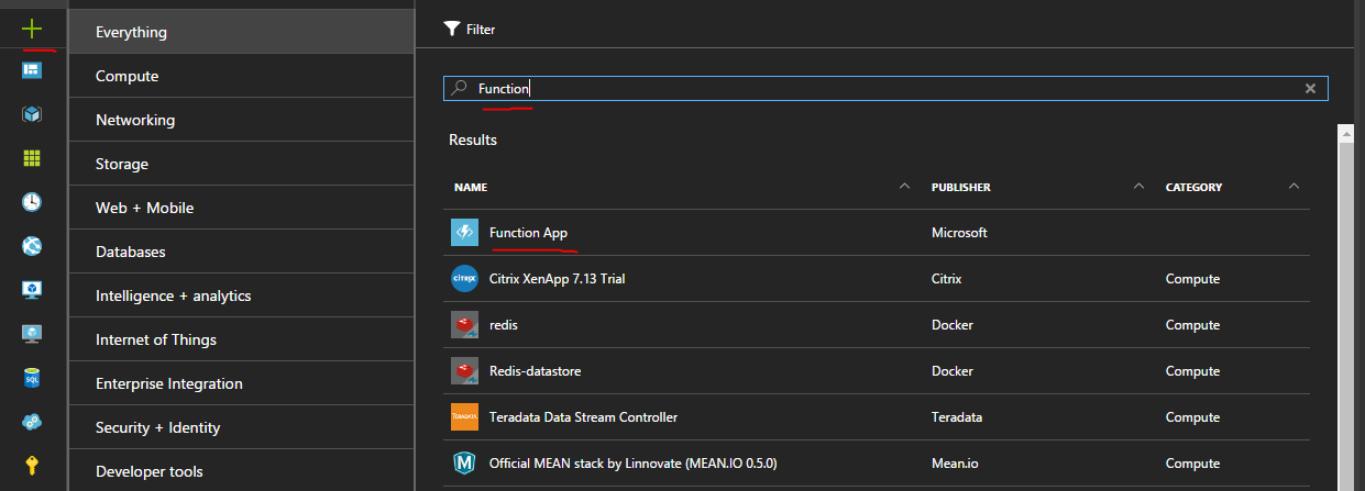 Next navigate to the new plus icon in the top left of your screen, search for function, and click the item labeled Function App published by Microsoft. After clickig create you'll have a few options. You'll notice that azure fuctions live inside of the *.azurewebsites.net subdomain, this is because technically they live in the Azure web apps ecosystem.