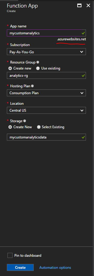You'll need to pick a name, location (I recommend a place near-ish where people will be calling the function), hosting plan, and a storage account.