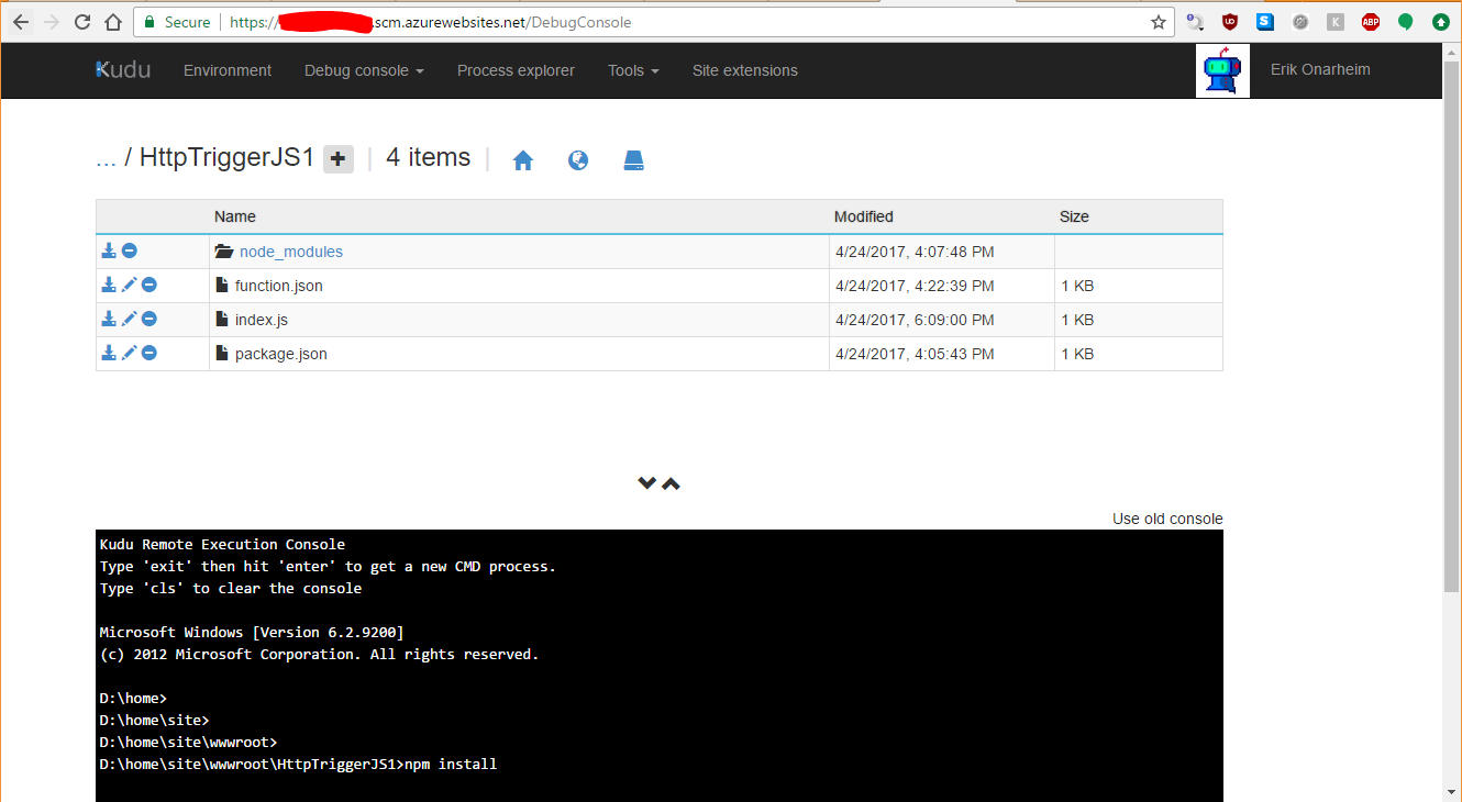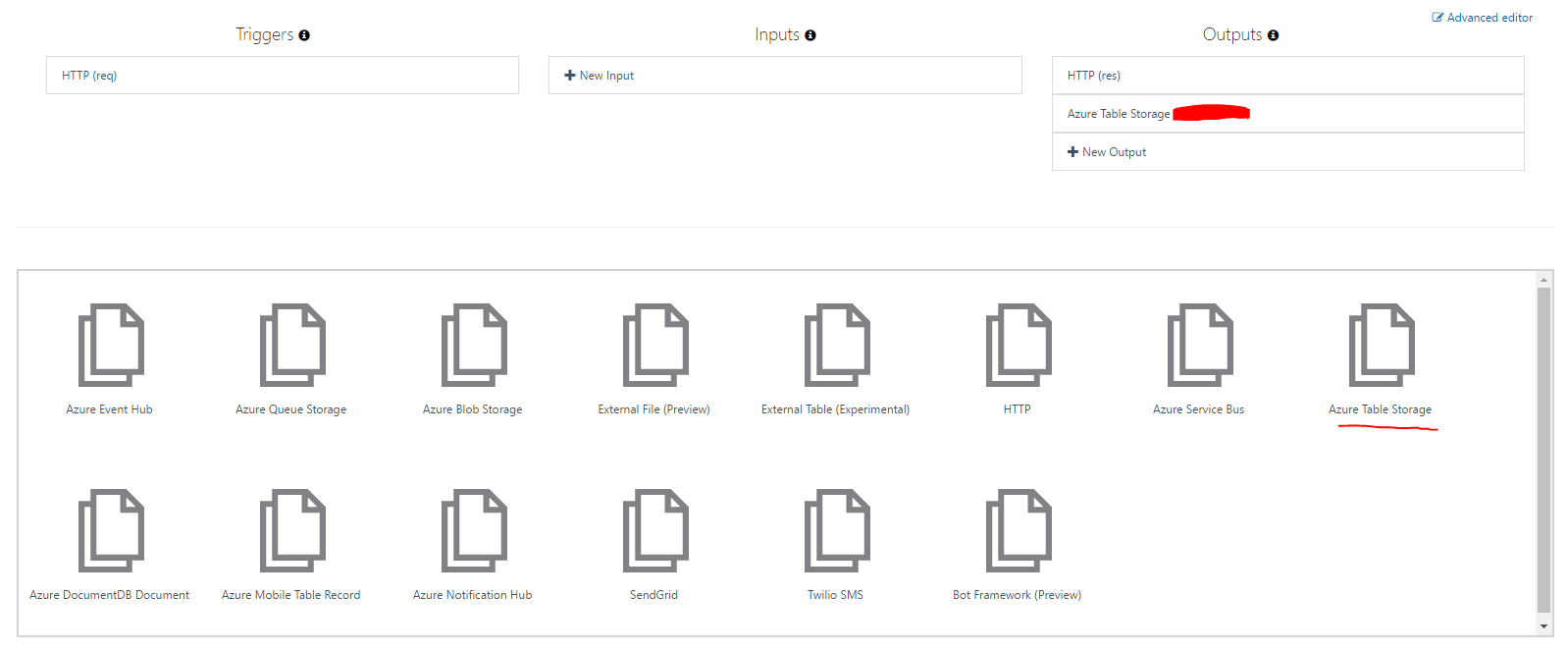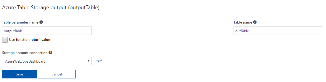 In this example I'm using the Node.js support in Azure functions to write a function. It is pretty easy to test and setup output to Azure table storage. It can even be wired up with source control so that code checked into github or another source code hosting provider is automatically deployed (Under Platform Features -> Deployment Options).